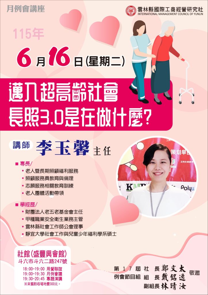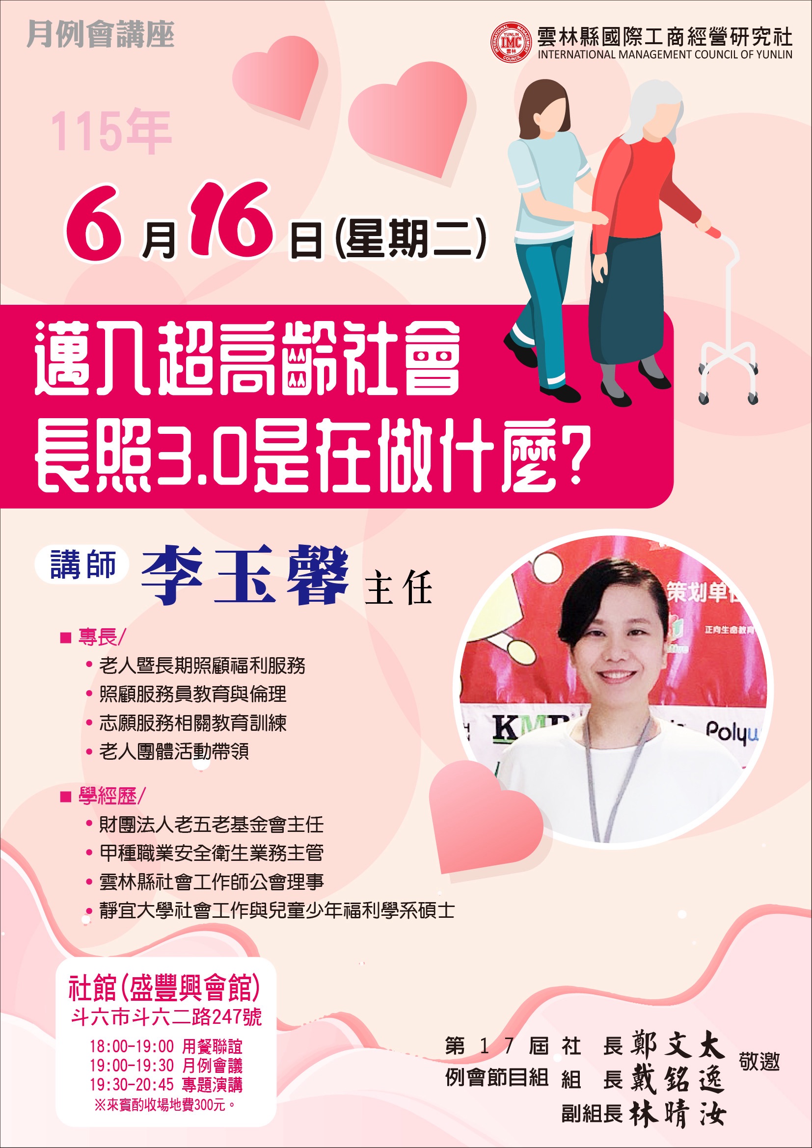 20260616 例會講師:李玉馨 主題:邁入超高齡社會,長照3.0是在做甚麼?