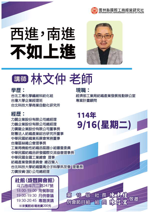 20250916 例會講師:林文仲 主題:西進、南進,不如上進秘書2025-08-15T00:13:18+08:0016 7 月, 2025|立即分享FacebookXRedditLinkedInWhatsAppTumblrPinterestVkEmail: