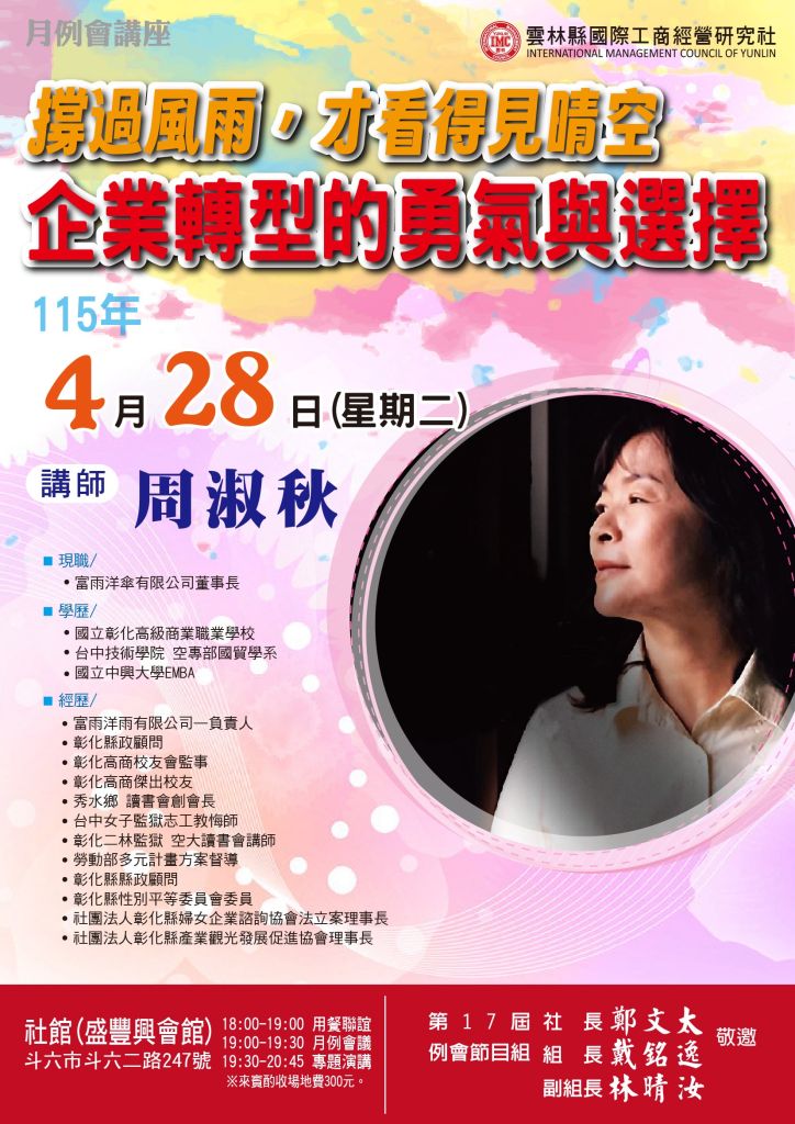 20260428 例會講師:周淑秋 主題:撐過風雨、才看得見晴空,企業轉型的勇氣與選擇秘書2026-04-25T12:52:23+08:0015 4 月, 2026|立即分享FacebookXRedditLinkedInWhatsAppTumblrPinterestVkEmail: