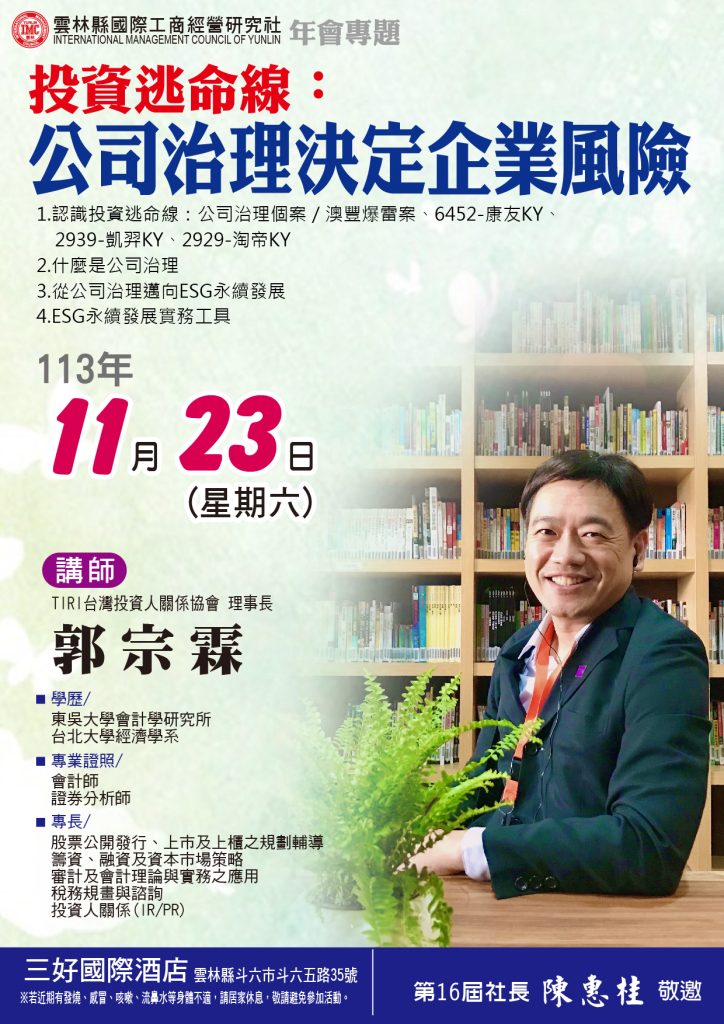 20241123 年會專題講師:郭宗霖 主題:投資逃命線:公司治理決定企業風險