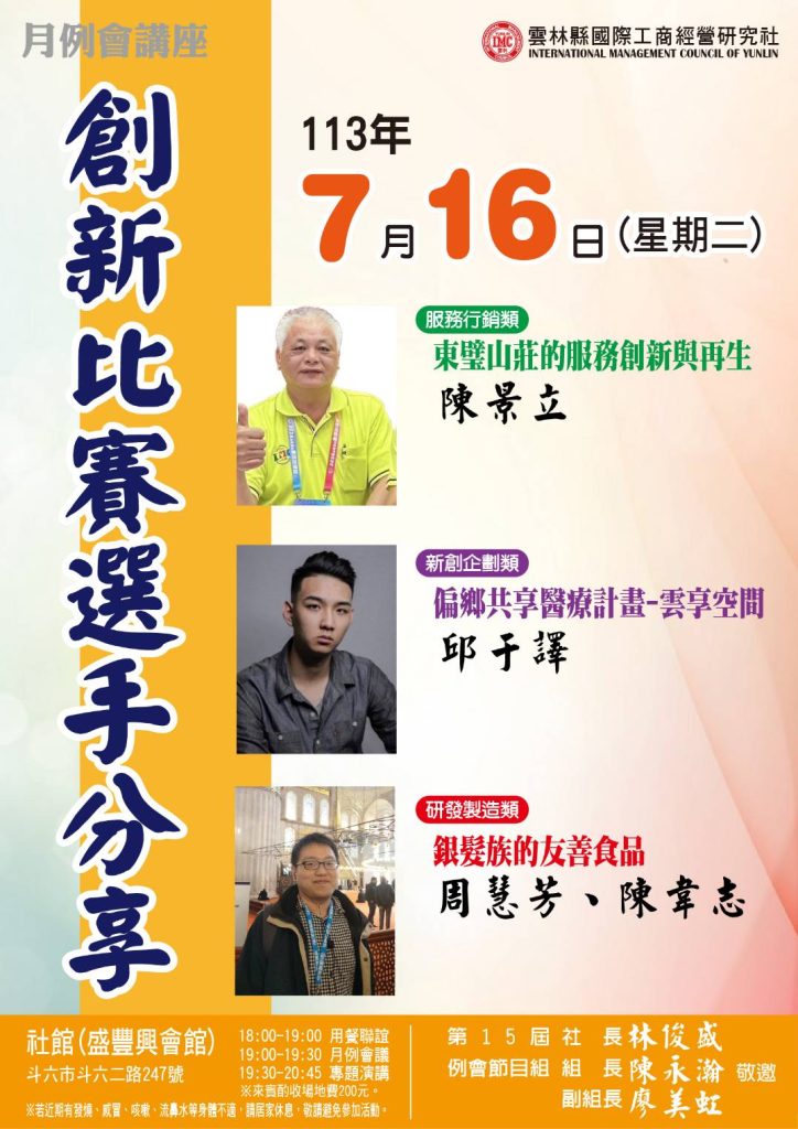 20240716 例會講師:陳景立 主題:東碧山莊的服務創新與再生、講師:邱于譯 主題:偏鄉共享醫療計畫-雲享空間、講師:周慧芳 陳韋志 主題:銀髮族的友善食品