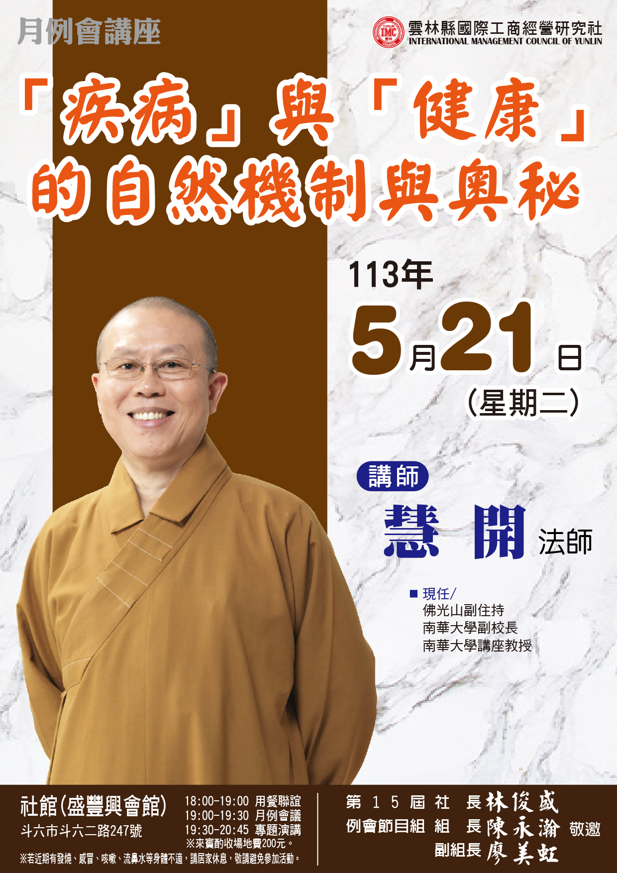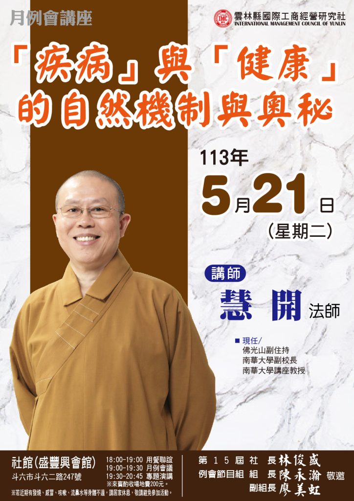 20240521 例會講師:慧開法師 主題:「疾病」與「健康」的自然機制與奧祕