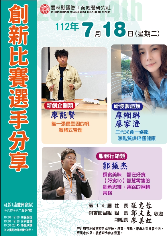 20230718 例會講師:廖能賢 主題:織一張最堅固的帆 海豬式管理,講師:廖緗琳、廖家澄 主題:三代米食一條龍 無麩質烘培極健康,講師:郭振杰 主題:饌食美味 智在好食【好食GO】智慧零售的創新思維,通路的翻轉策略