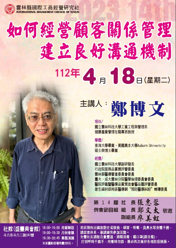 20230418 例會講師:鄭博文 主題:如何經營顧客關係管理,建立良好溝通機制