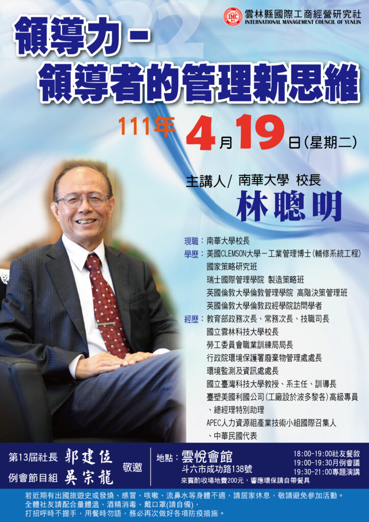 20220419 例會講師:林聰明 主題: 領導力-領導者的管理新思維
