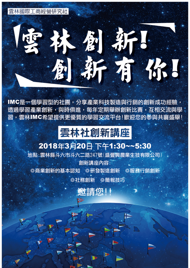 第九屆雲林IMC3月例會及創新講座─雲林創新!創新有你!【第九屆雲林IMC3月例會及創新講座─雲林創新!創新有你!】時間:2018年3月20日(二) 13:30~17:30 創新講座(限額70名) 18:00~19:30 […]