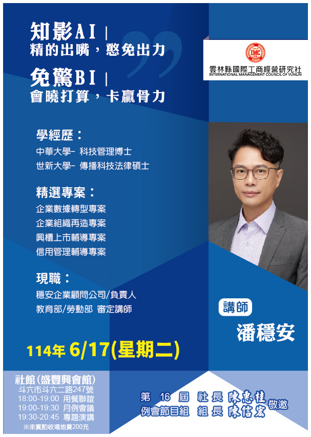 20250617 例會講師:潘穩安 主題:知影AI-精的出嘴,憨免出力/免驚BI-會曉打算、卡贏骨力