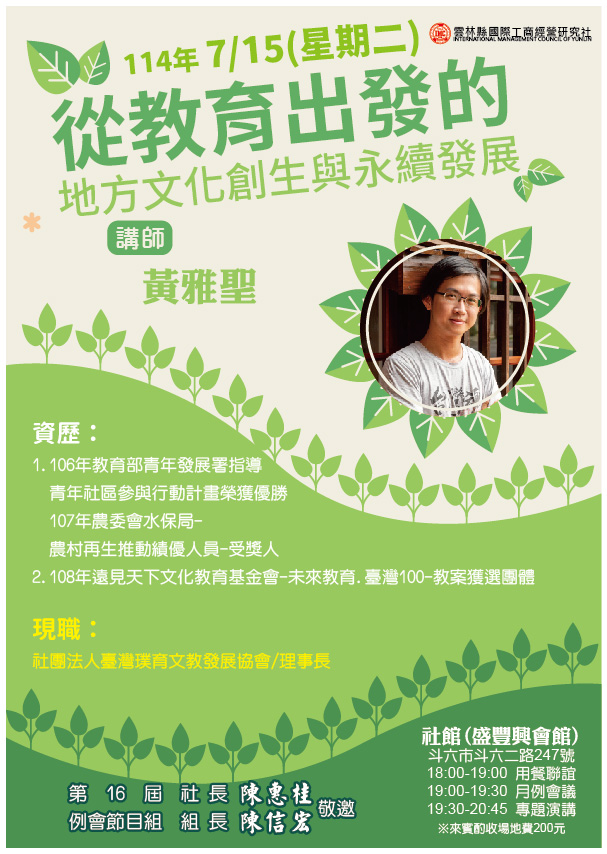 20250715 例會講師:黃雅聖 主題:從教育出發的地方文化創生與永續發展